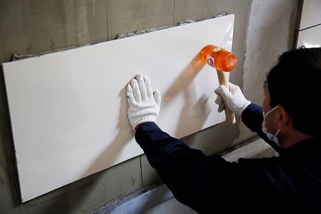 最后,将瓷砖压于涂有瓷砖胶(表层未干)的基层之上,通过橡胶锤敲击、挤压的方式(标注:此道工序所需工具名称需要客户提供)让瓷砖与基层达到严丝合缝的效果,保证铺贴的平整和美观。