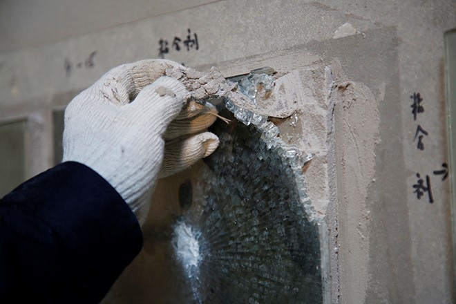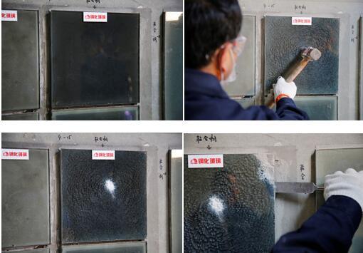 排名前列、锤砸:在已经施工完毕的“钢化玻璃”实验区域,使用铁锤从正面、边角两个位置重击,其一是查看瓷砖胶的防滑性能以及防位移、防变形的表现,结果描述大致为平整的钢化玻璃被重击后,裂纹均匀分布;边角被砸掉,但整块玻璃仍未发生位移。