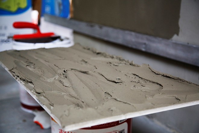 接下来,正式瓷砖铺贴开始之前,需要完成两道工序,其一为基层的处理。达到无油渍、无松散表层即可,然后用抹刀将瓷砖胶薄涂于基层之上。
