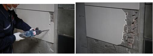 第二、电钻:此环节较具看点,使用电钻在施工完毕的瓷砖上正面钻孔,钻孔周围的瓷砖并没有发生裂变,此后从破裂处侧面继续钻孔
