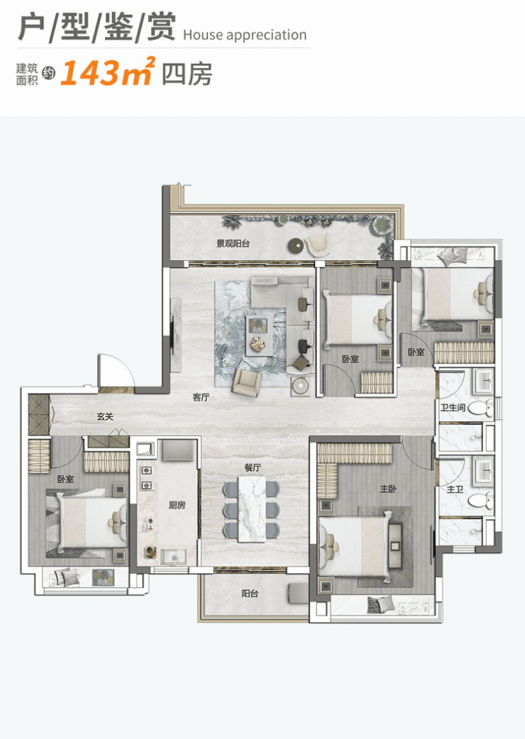 竖厅设计,公区LDKB一体化,约3.5米南向观景阳台,带有主卧套房。