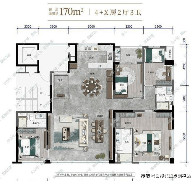 户型三:建面约170㎡,4+X房2厅3卫