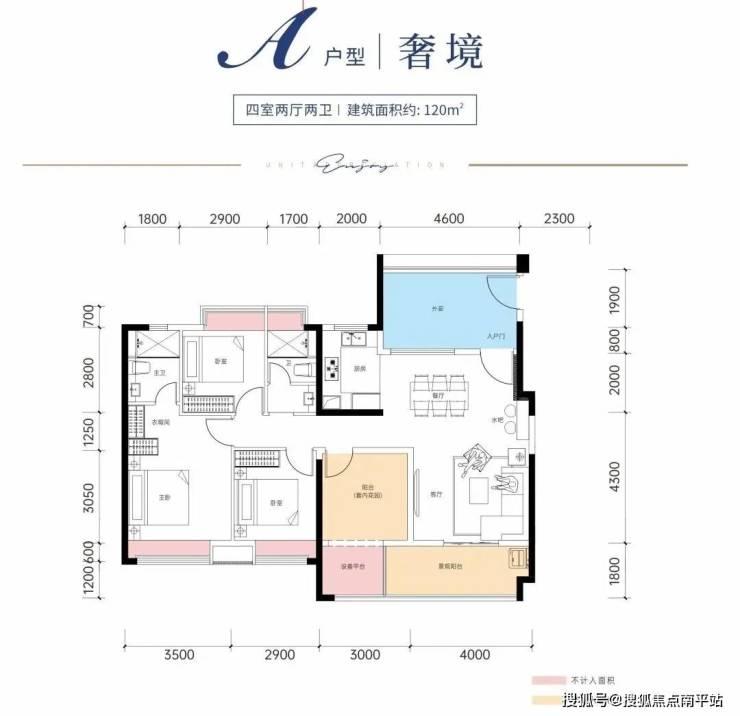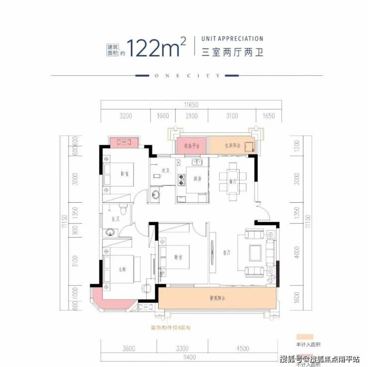 建面约120㎡户型:采用大面宽设计,南向整体面宽约13.4米,南向景观阳台约7米,尺度相当奢阔。入户外廊,可做花园+品茶区;户型南北通透,四开间朝南,主卧大套房,三个卧室带飘窗,设计非常优秀。