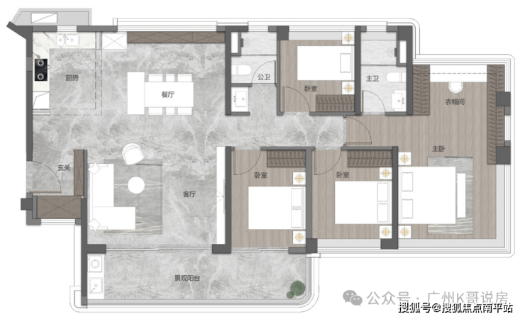 先来看95㎡的户型,南向三房设计,客餐厅和阳台开间去到5.6米,也可改四房,主卧套房设计,带270°大飘窗。