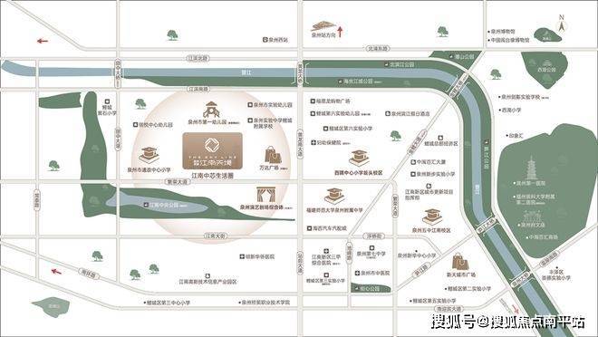 地段优势:繁华配套在侧。项目左邻泉州通政中心小学田中校区,右临鲤城万达广场(在建),东南侧为泉州演艺剧场综合体(在建),周边还有泉州实验中学鲤城附属学校、泉州五中江南校区(规划)、江南中央公园(规划)等丰沛资源环伺。