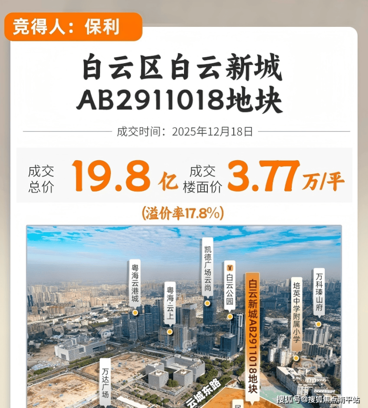 2025年12月18号,保利发展以19.8亿元夺得白云区白云新城AB2911018地块,楼面价37703元/平。
