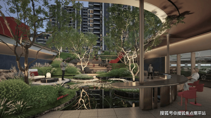 建投·诗意汾河项目采用置石、理水等现代造园手法,搭配丰富植被打造鲜氧生态景观。设置园林会客厅、下沉式观景台、休闲吧台等,充分增加人与景的互动性,提升社区空间的层次感。