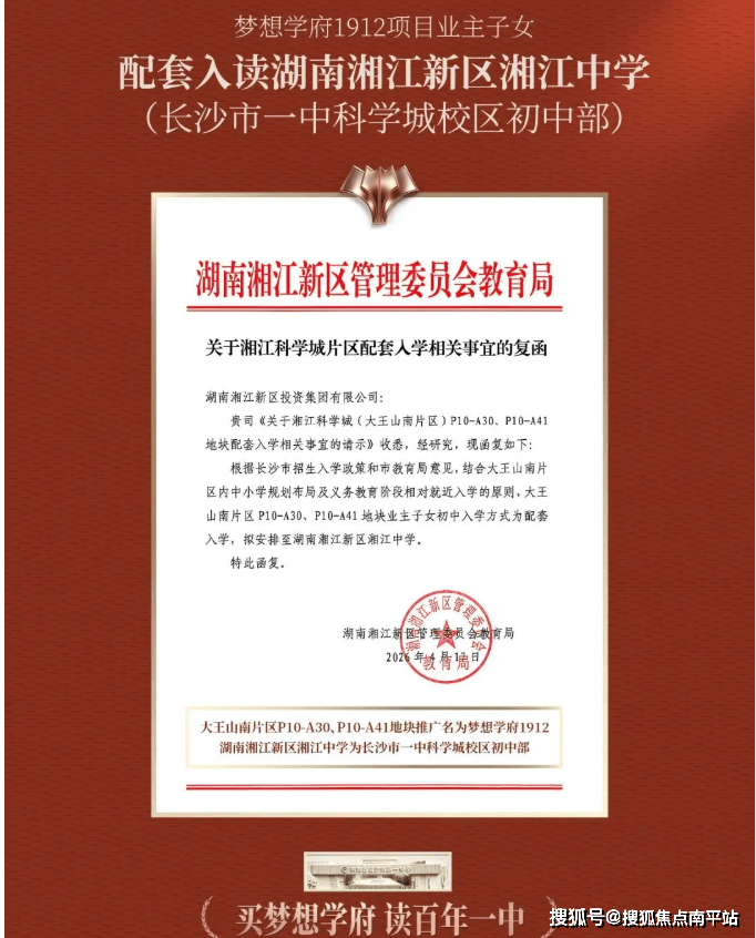 近日,梦想学府1912拿到了湖南湘江新区教育局红头文件:明确楼盘业主子女配套入学长沙市一中科学城初中部。