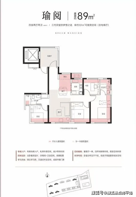 建面约89平户型:纯板楼小高层+私梯入户,四开间朝南,可使用空间(含电梯厅)约101m²,得房率约113%,可做四房,相当于以前130平户型。