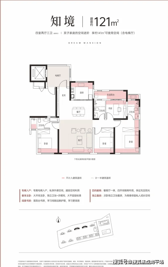 建面约121平户型:纯板楼+私梯入户,四开间朝南,双套房朝南,可使用空间(含电梯厅)约141m²,得房率约116%,可做四房两厅三卫,相当于以前160平户型。