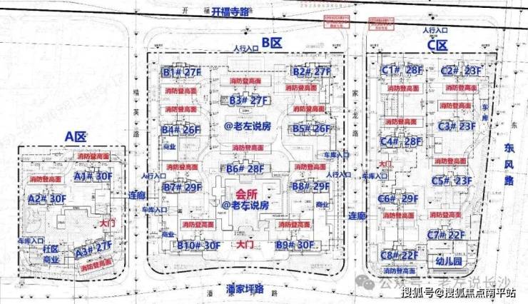 项目规划21栋高层住宅,B地块配备下沉庭院会所,三个地块通过天桥连接,基本每栋都做了架空层。预计2026年5-6月首开B地块。