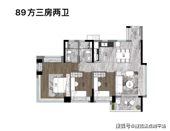 89㎡户型是南北对流,4开间朝南+大飘窗,全屋四季采光通风不用愁,而且入户花园外置,收纳效率提高不少。主卧带270°飘窗房间通风也在线.