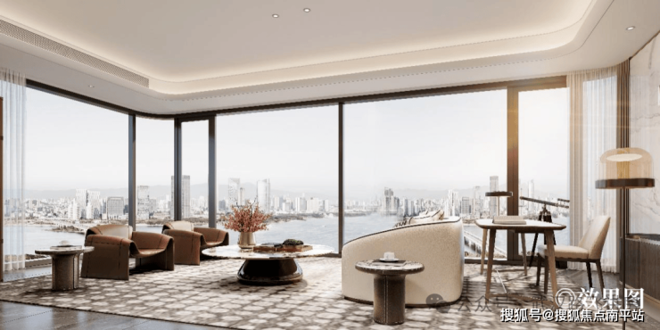 在产品设计上,每户沿江面均配置全景落地Low-E玻璃幕墙,约7.4-9米的瞰江横厅、“双全景舱”等创新设计,实现270°无界江域视野。