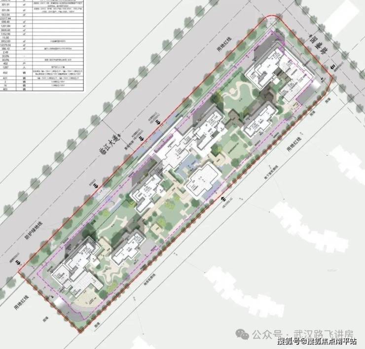 项目共规划了4栋30-31层的高层住宅、2栋44层的超高层住宅和部分社区底商。总用地面积2.58万方,总建筑面积约8.97万方, 容积率2.49,户数402户,车位配比1∶1.07。