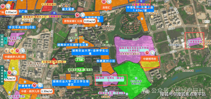 从图中可以看到中建博萃府的位置,距离中建桃李九章一期二期实际有一定的距离,距离在建中的湘郡培粹一校两址的位置大概600米左右,距离未来规划的小学,距离大概700米。