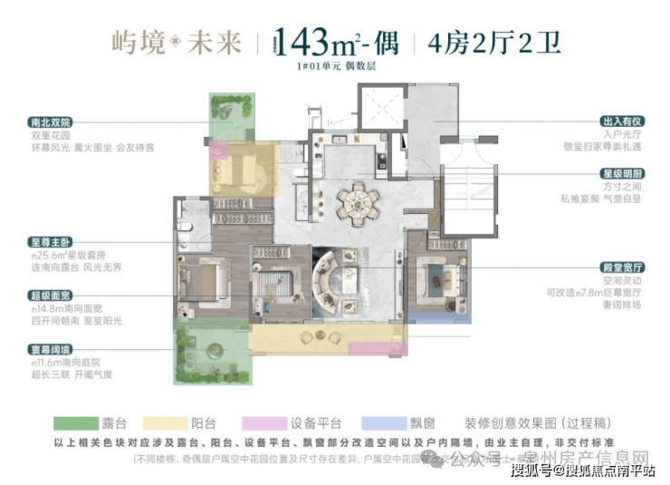 143㎡做到了4房,明显是冲着深度改善客户去的。这个户型把“院子”玩得更大了,南北两面都有花园。其中, 偶数层的南向庭院竟然做到了 约11.6米长 ,而且直接连到主卧,私密性和奢华感瞬间拉满。客厅根据需求改造,最大能扩出 约7.8米的“巨幕宽厅” ,开个家庭派对绰绰有余。满足晋江事业有成、注重家庭和社交圈层的业主。