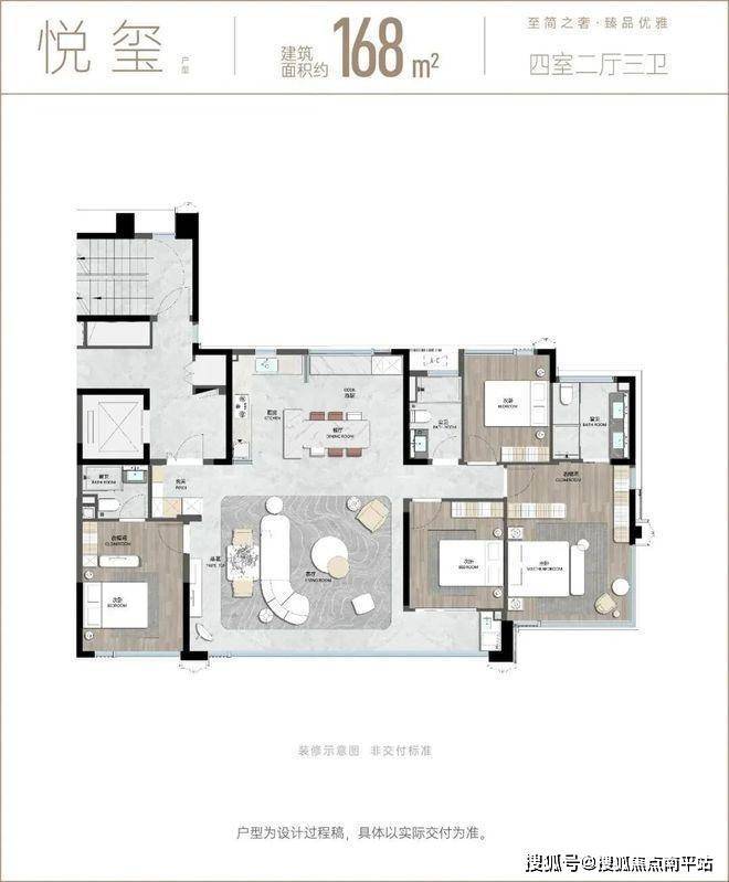 其中168㎡户型采用双主卧套房设计,配备独立电梯厅,私密性与舒适性兼具。