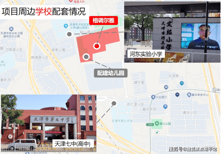 项目西南侧为配建的15班幼儿园,西北侧是河东排名第一、天津前十的河东实验小学,项目南行约300米、成林道南侧为天津市首批重点、全市排名第六的天津七中(高中)。
