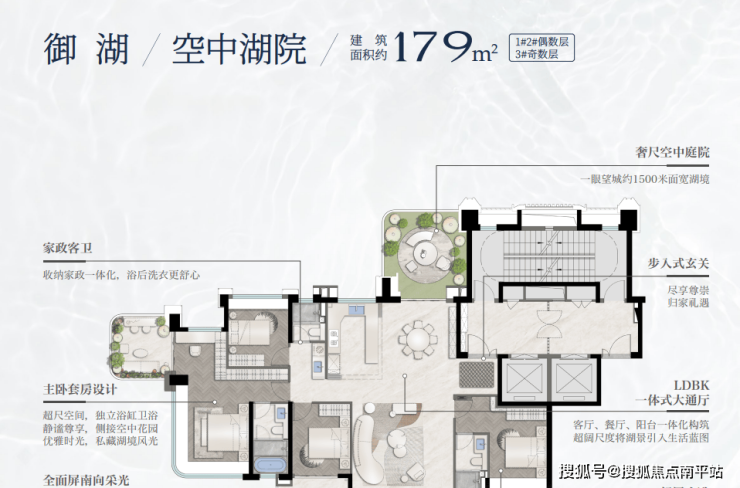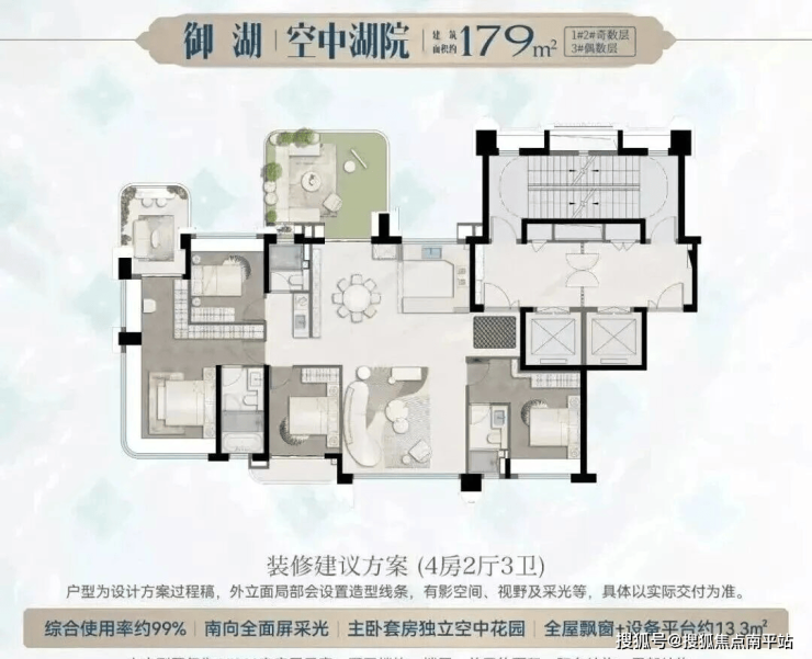 望湖建面约179㎡户型,约30平双露台打造“空中湖院”,还带约10平的独立电梯厅,空间使用率高达近100%,层高约3.15米,约70m家庭欢聚空间,套内可比肩220m大平层。全屋6开间朝南,北向又几乎是全明露台和开窗,高区推窗尽揽约1500米宽阔湖面。
