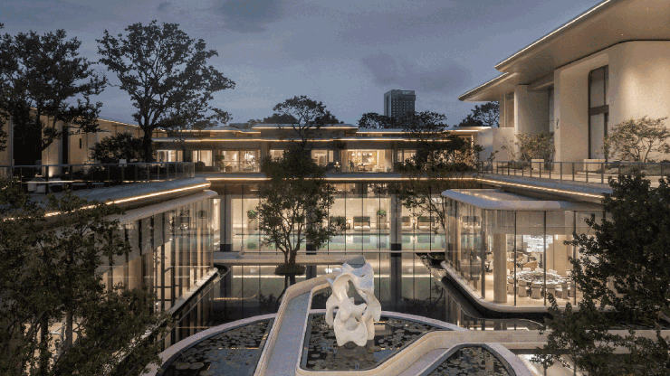 外立面是豪宅标配的玻璃幕墙+铝板,做了弧度,很有线条感。