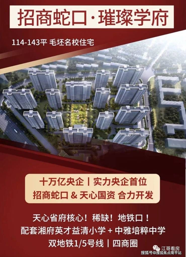 项目概况:招商蛇口·璀璨学府由十万亿央企招商局旗下招商蛇口匠造,是招商蛇口长沙公司入湘的第9子,也是璀璨系“湖湘首作”,基于城市深耕的深刻践行,通过对时代青年生活轨迹和需求的研究,远瞻城势所向,以先于时代的创见,与天心的伟大理想交相辉映。项目规划为建筑面积约114-143㎡的高层产品,内部规划打造约0.8万方中央公园等。致力于打造天心区配套完善、品质突出、生活优质,适合青年置业的头等舱住区。