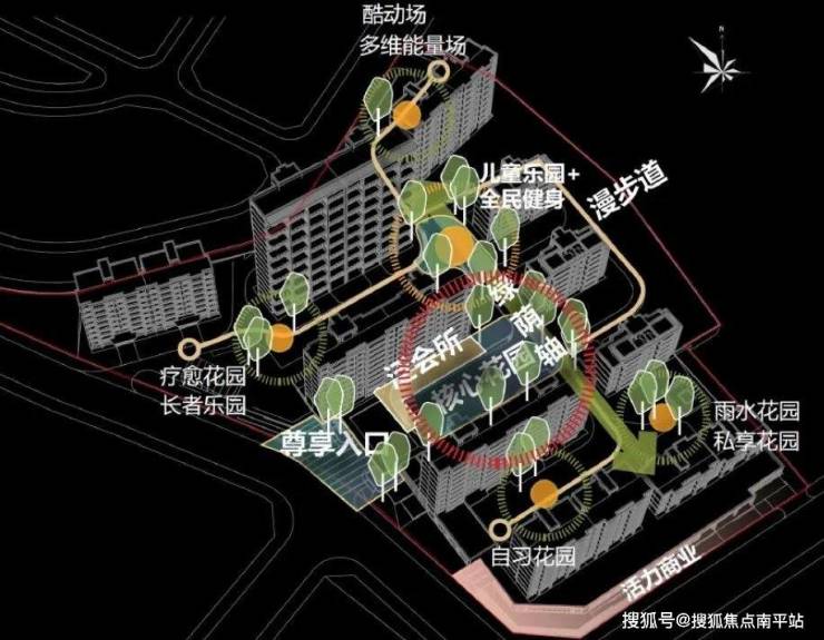 「两轴」分别是归家礼仪轴和生态林荫绿轴;「一漫」是漫活休闲步道;「三园」是美学生活花园、儿童乐园、睦邻休闲花园。