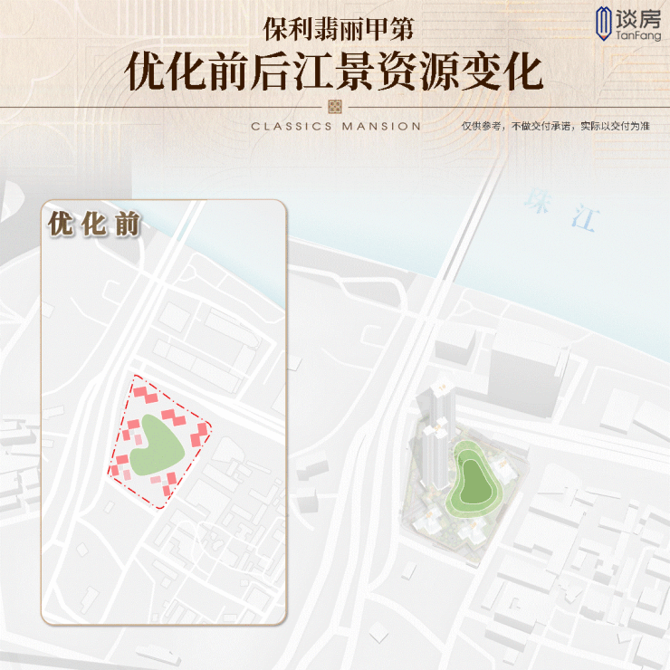 看楼栋优化前后的对比示意,有效增加江景单位占比,均好性明显提升。