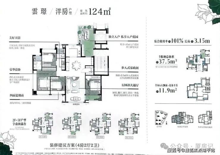•124㎡洋房独门独户带入户花园,2至5层部分位置有南向晒台,综合使用率达101%-109%