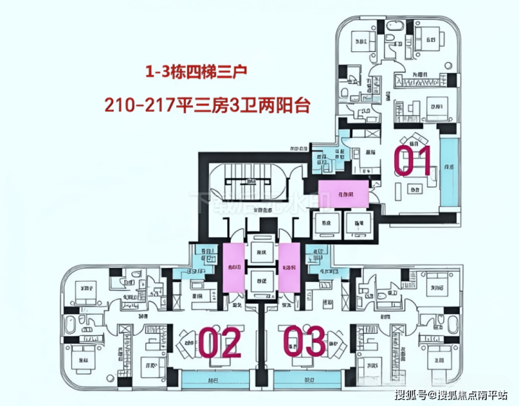 每户都是专梯入户+入户空间。C栋位于小区最里面,东南向户型(218㎡01)会被A、B栋遮挡。
