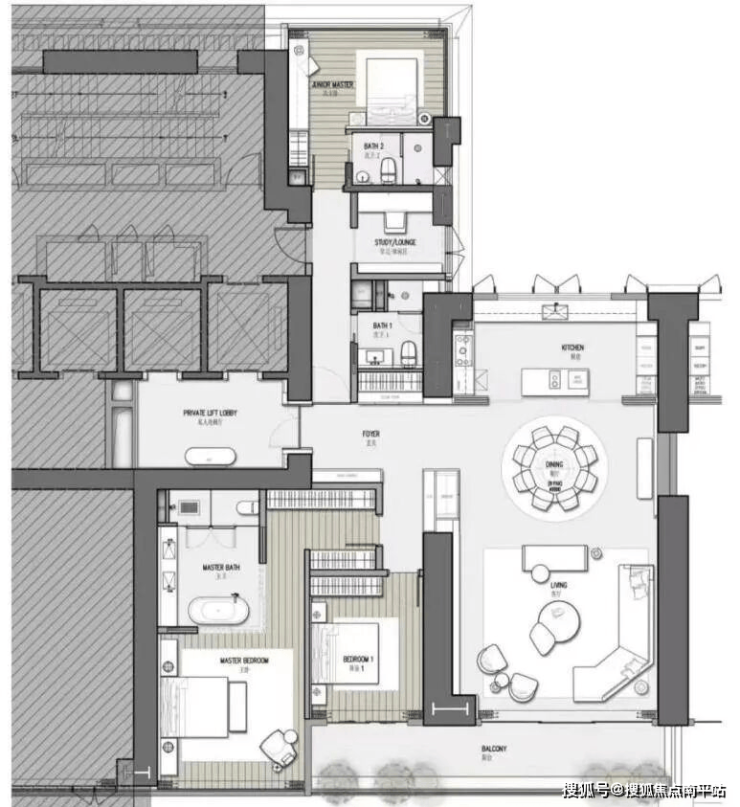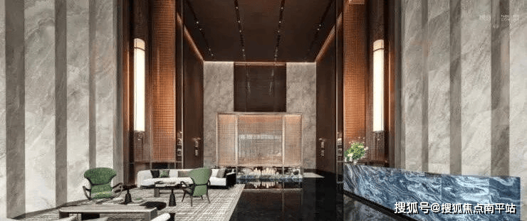 首层大堂约12米层高、约260㎡面积,水云灰石材墙面、太古黑金石材地面、紫山奢石接待前台,呈现出奢华酒店般的恢弘气度。