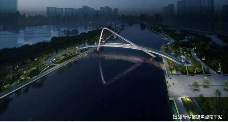 设计以“美韵绿洲,力铸两岸”为理念,采用反C型平面布局与不对称三角流线拱结构,桥面设多元功能分区,兼顾骑行、漫步、观景与休憩,进一步提升沿岸城市客厅活力。