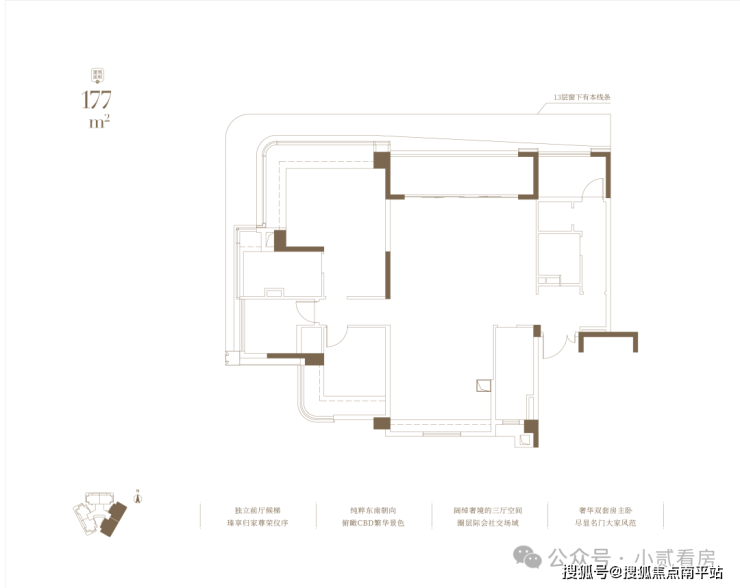 建面177㎡户型,纯粹东南朝向,俯瞰CBD繁华景色,奢华双套房主卧,尽显名门大家风范。