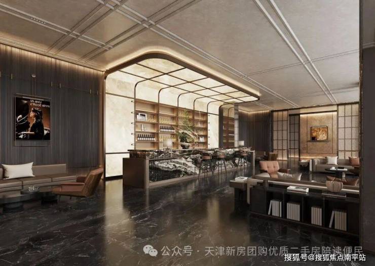 借鉴飞艇设计打造入户大堂,弧形穹顶与石材碰撞。通过精准曲面比例,塑造视觉失重,营造悬浮美感。