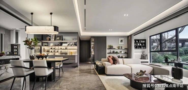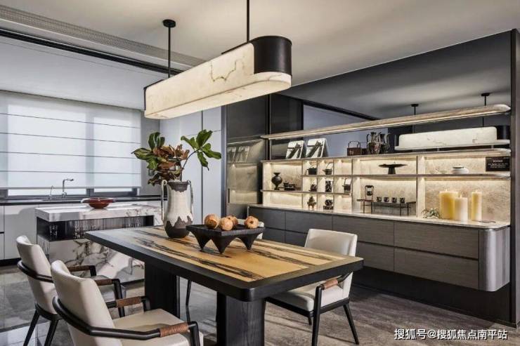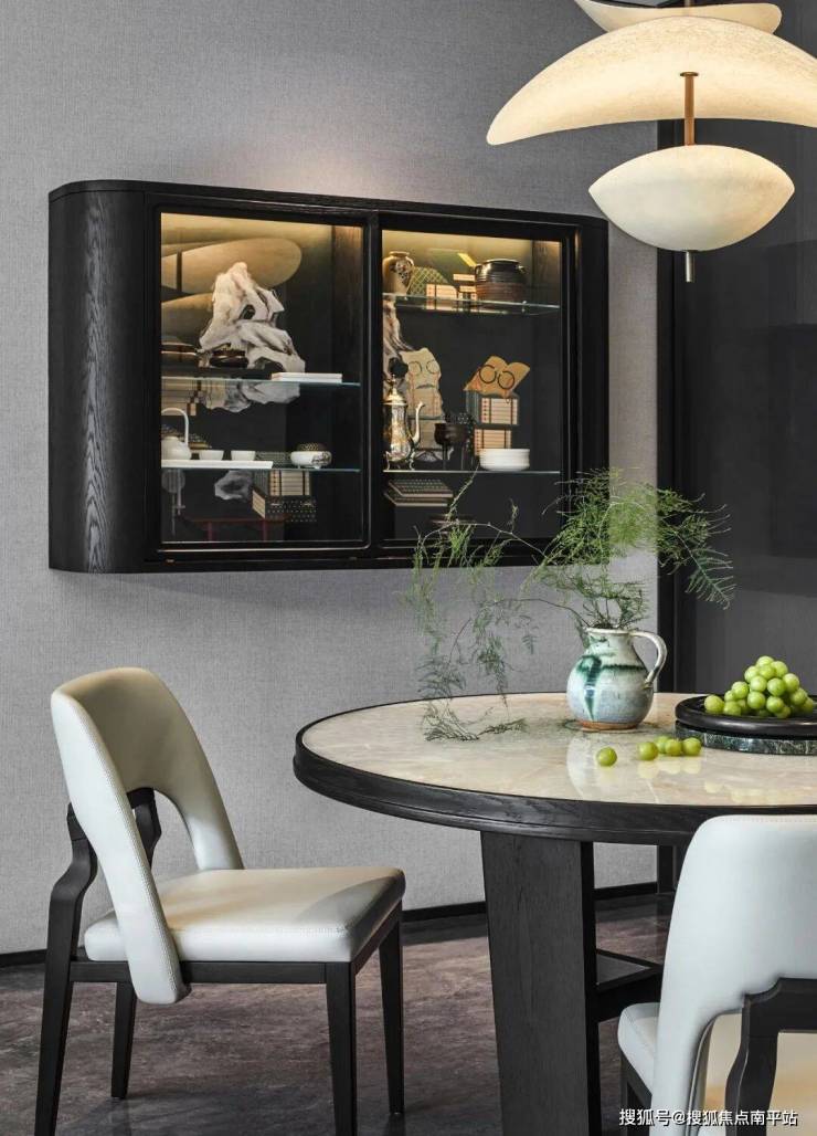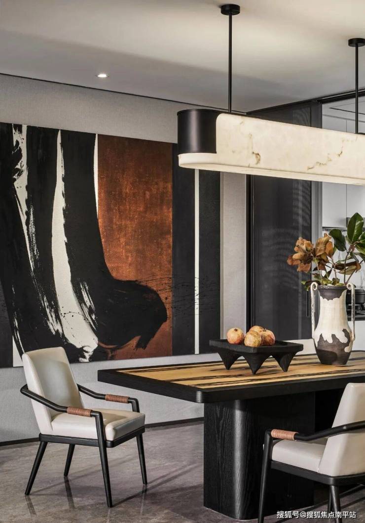 围坐餐厅,开启悠然从容的闲叙时光。东方写意的抽象画赋予餐厅自在飘逸的艺术氛围,弧形吊灯从曲线延展中勾勒流动之美,在松弛有度中寻找生活的盛宴。
