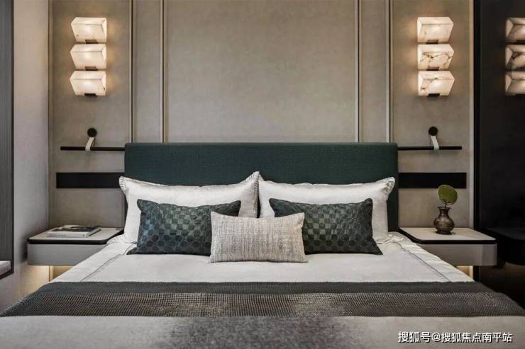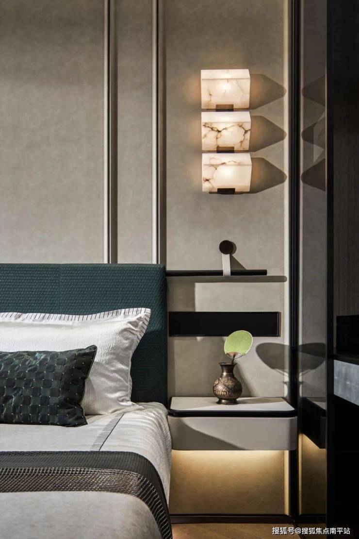 缥色属水色,是一种透明色,有人说「天青色等烟雨」中的天青色就是缥色天青过雨,远处空中渐蓝渐绿间掺着灰,设计师将这般有氧的意境保留在睡眠空间,宁静又柔软。