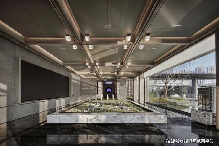 沙盘区以中式的阵列和礼序感呈现,华美的纹理和光影的摇曳共同营造出庄重的氛围。使用带有流水云纹的大理石打造了尊贵的中岛区,顶部以宫灯形式排列,沿着金属格栅的引导,逐步引导人们进入艺术的世界,感受时间的沉淀和城市的内涵。