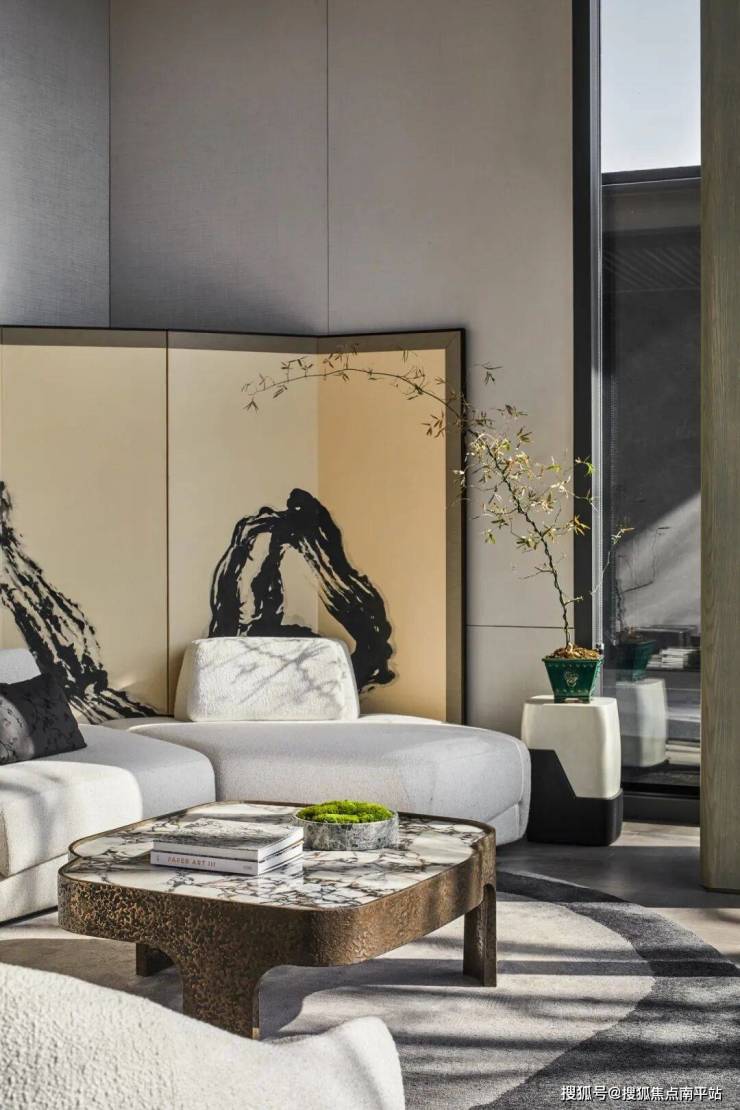VIP室引入了东方写意的水墨屏风,将玉山雅集的优雅趣味融入空间,借助山林的气势与水面的结合,创造出一种朦胧而美丽的水光效果。树影婆娑,映照在柔软的米白色沙发上,如同诗画一般,以简约纯粹的色彩和布局,回归自然的本质,感受万物的灵性。