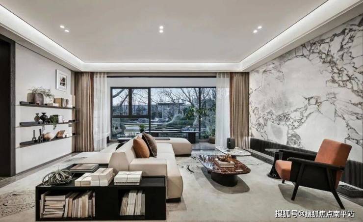客厅以柔和、安然的暖色调诠释,暗红色的单椅与大理石茶几,搭配米色沙发与水墨大理石背景墙,深与浅,豁达与入微,沉淀与当下,共同拓写隽永美学的故事。