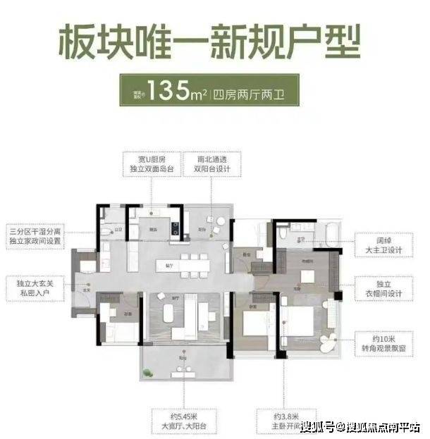 135平户型:南北通透双阳台设计,客厅宽厅达5.25米,阳台宽度达5.45米。