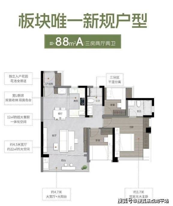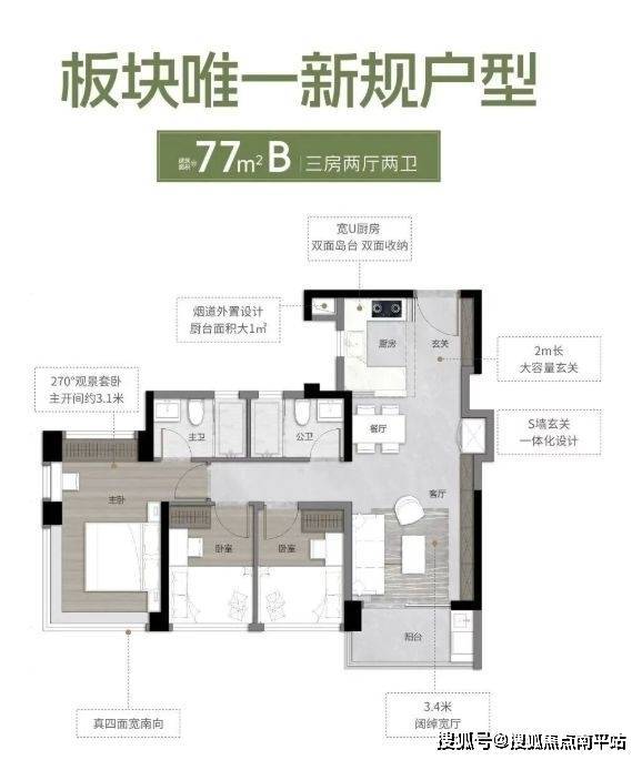 77平A户型:三房两厅两卫,采用LDKB一体化客厅设计,主卧设有270°全景舱。营销部☎️☎️电话:400-159-8559转接7777【☎营销部电话已认证】
