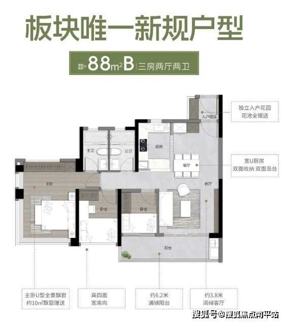88平B户型:南向三房两厅两卫,配备步入式衣帽间,客厅开间达3.9米。