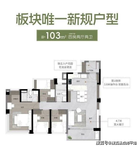 103平户型:四房两厅两卫,带有独立入户花园和约7米通铺阳台。营销部☎️☎️电话:400-159-8559转接7777【☎营销部电话已认证】