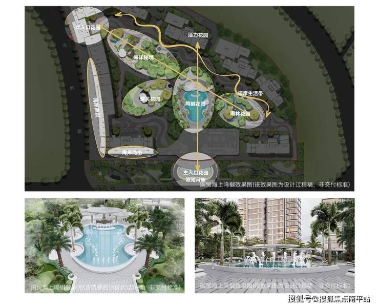 取法国际奢享度假酒店规划灵感, 匠心打造海月森屿滨海度假式庄园, 超6000m中庭园林+ 双轴一心一带多花园+ 贸贸岛儿童游乐区+中轴戏水区等 ,奠定了度假式生活底色的“高级感”。