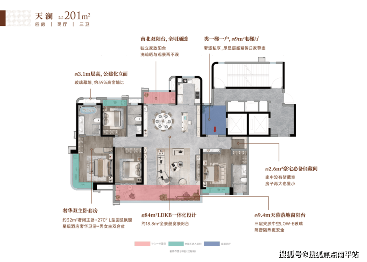 · 两梯两户设计,类独立入户,赋予专属感和超强收纳功能;创新双入户系统,提高便利性和私密性。