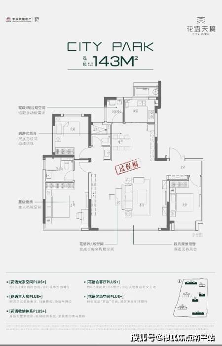 143㎡的小高层及洋房户型是项目的主力产品,拥有独立入户厅,可以打造一排鞋柜和收纳柜,满足家庭的日常需求。6.5米超大横厅落地窗和主卧转角落地窗设计,让整个空间更加通透明亮。此外,还设置了独立的家政空间,方便存放洗手池、洗衣机、烘干机等家庭设备。采用LDKB布局,打通客厅、餐厅、厨房和阳台之间的区隔,让家庭生活更加便利和舒适。
