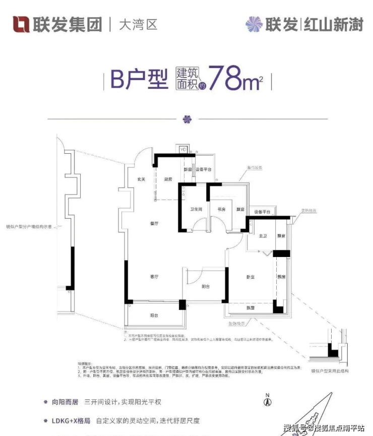 约78㎡的2+1房2厅2卫,设计的是竖厅LDKG+X格局,S墙设计预留冰箱卡槽位,做到了主卧双飘窗,三开间朝南,动静分区,U型大厨房,厨房烟道还做了外置空间,可以更好的利用厨房空间,卫生间三段式干湿分离。赠送了双阳台一半面积+6面飘窗+双设备平台,超100%得房率,东南或西南朝向。这是整个红山板块唯一一个80平以下做到了3房2卫的户型。