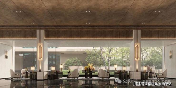 镜面水院倒影建筑美学,风雨连廊串联下沉庭院(叠泉绿台),园林即金融精英的第三会客厅。