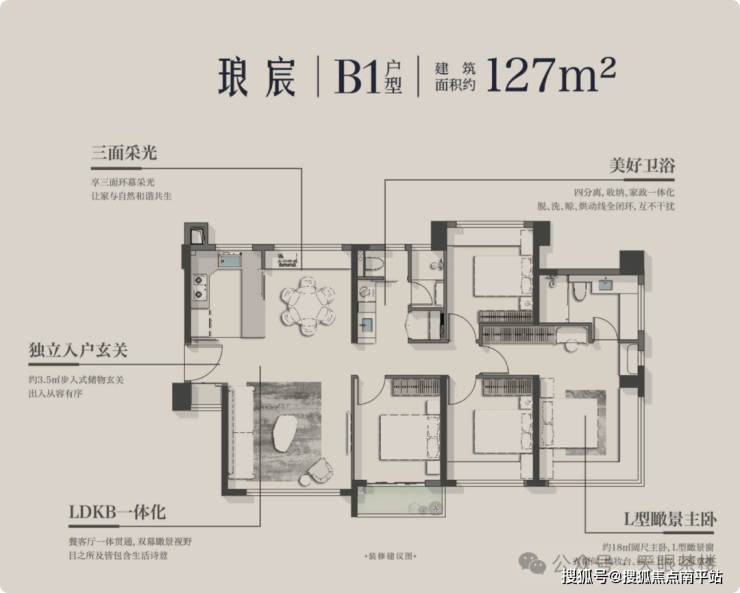 ●约52平家庭欢聚厅,独立餐厅,大圆桌、餐边柜、过道轻松安放;约7.4米双阳台,满足全家庭喝茶、运动、养花等爱好