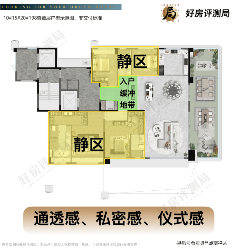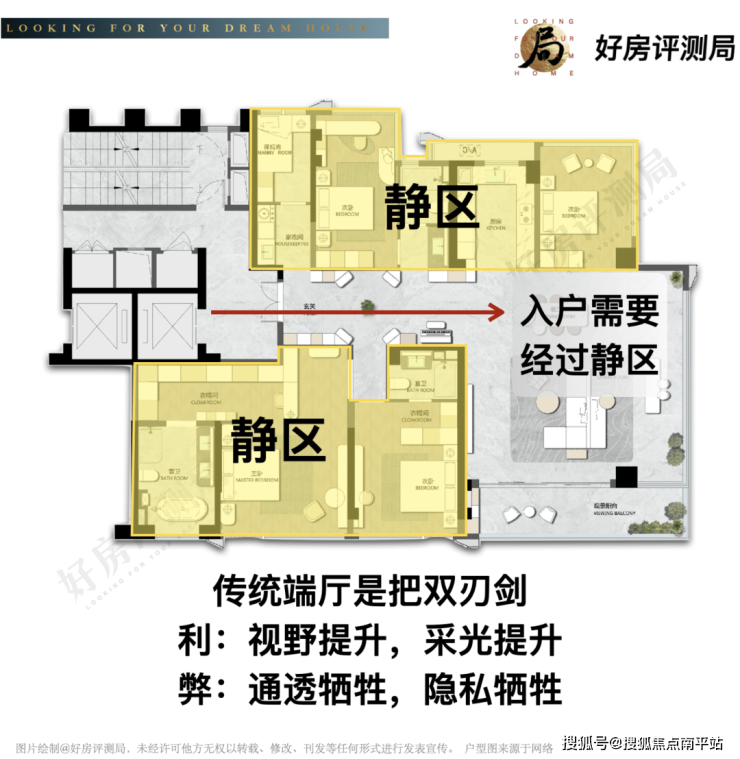 以前大平层端厅,大多都是半伸展,且多数只关注面宽,而要牺牲南北通透,且因为户型进深不足,入户动线需穿越卧室区,牺牲私密性。