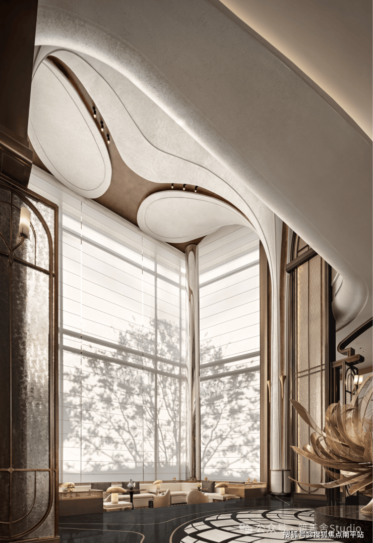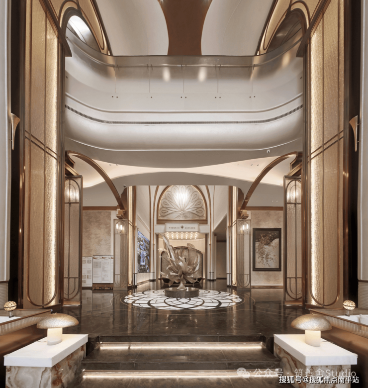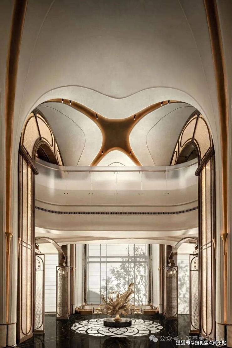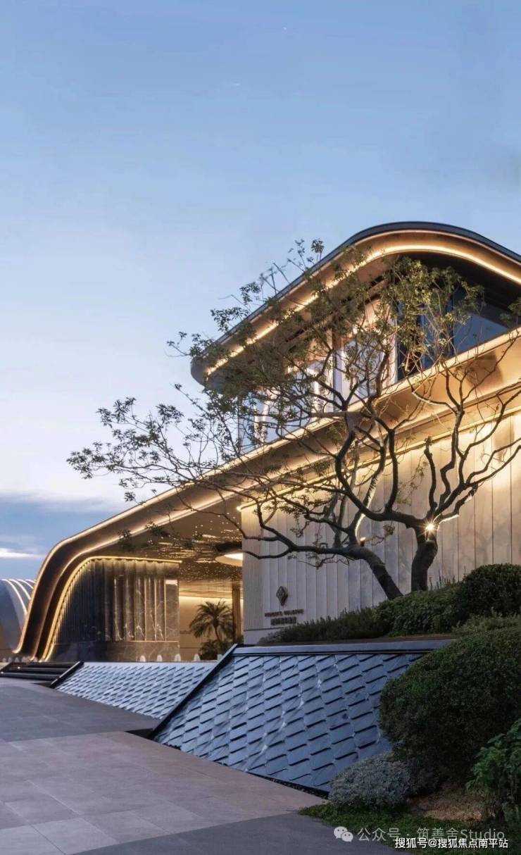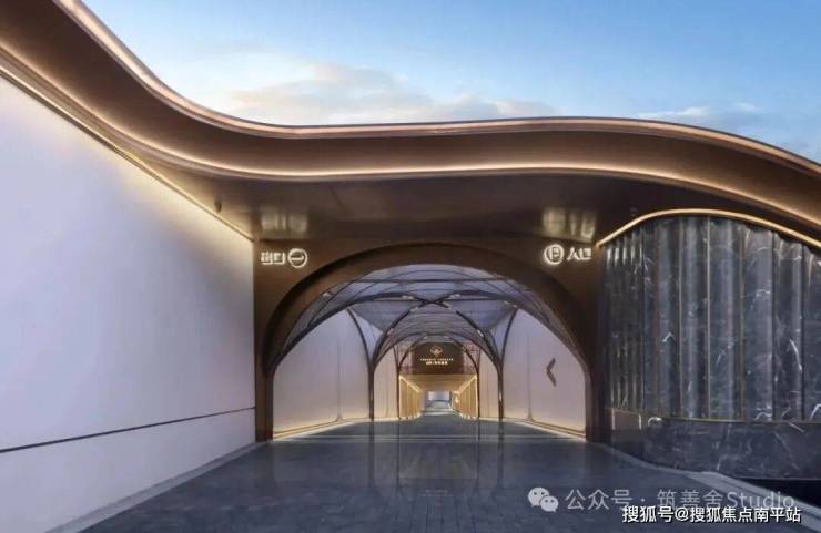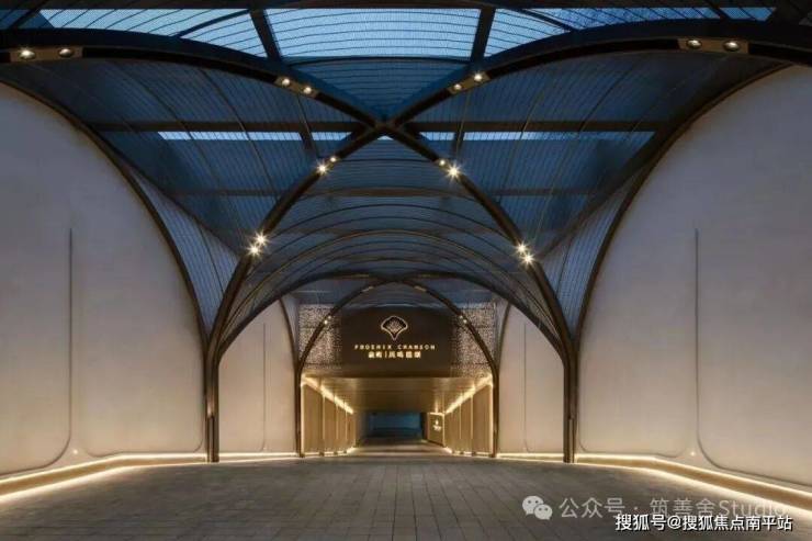小区大门入口处一条优雅的曲线巧妙延伸,它不仅是建筑的起始点,更是将建筑、社区入口与地下车库入口三者和谐统一的纽带。设计灵感源自凤凰花,屋檐巧妙运用香槟金铝板勾勒轮廓,立面则以大理石铺陈,整体尺寸为67米长、7.5米高,展现出优雅与精致。它生动诠释了“凤凰木——自然生长”的理念。正对入口的造型宛如一朵绽放的凤凰花,顶部的穿孔板则模拟凤凰羽毛的形态,呈放射状展开,将凤凰木的自然之美淋漓尽致地展现出来。
